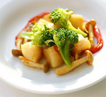 - しめじとホタテを加えて炒め、ホタテの色が変わってきたら、ブロッコリーとパプリカを加え、しょうゆと酒で味付けをする。
