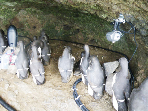 高さ25メートルの崖のくぼみにある繁殖地にはこれまで、デコイ(鳥の模型)の設置などが行われてきましたが、今年は2台のビデオカメラと10分おきに静止画を撮影する自動カメラ1台を設置。また、崖の下に昨年と同じく、ウミガラスを誘引する音声装置が設置されました。