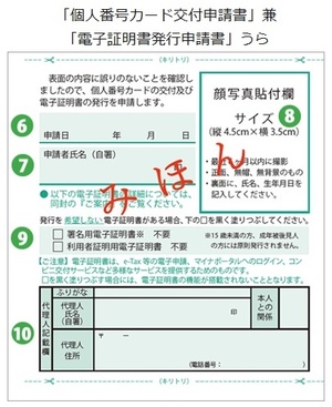 - 署名用電子証明書、利用者証明用電子証明書発行の有無を意思表示する欄です。電子証明書は、e-Tax等の電子申請、マイナポータルへのログイン、コンビニ交付サービスなどの多様なサービスの提供を受けるために必要なものです。□を塗りつぶすと、電子証明書が発行されませんので、ご注意ください。