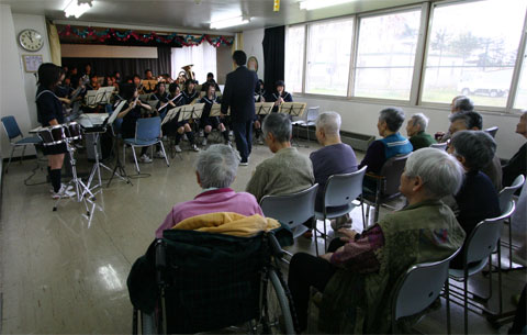 写真は特別養護老人ホーム「しあわせ荘」での吹奏楽部の演奏風景。冬のソナタの主題歌など6曲が演奏され、集まった入所者の皆さんは手を叩いてリズムをとりながら演奏に聞き入っていました。