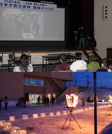 会場の外では、かがり火とアイスキャンドルが灯され、追悼と復興への願いが込められていました。