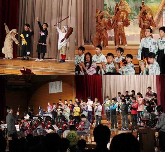 今年も、5年生による表現では、伝統の衣装に身を包んだ「こきりこ」が披露されたほか、6年生の器楽演奏では、ロンドンオリンピックのテーマ曲「風が吹いている」を演奏、会場から大きな拍手を受けていました。小学校ではじめての学芸会となる1年生は劇「新・ブレーメンの音楽隊」で、堂々と大きな声でりっぱな演技をみせてくれました。