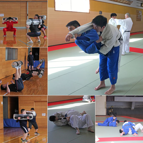 4日から7日までの4日間、北海学園大学柔道部(監督、コーチ、部員合わせて9名)が当町で合宿を行いました。4日の午後到着後、早速武道館で練習を開始しました。2日目以降は町内のランニングをはじめ、午前中は武道館で立ち技、寝技など基本練習を行い、午後からは総合体育館で基礎体力、体幹などのトレーニングを行いました。合宿中は寒い日が続きましたが、選手たちは汗を流しながらトレーニングに励んでいました。