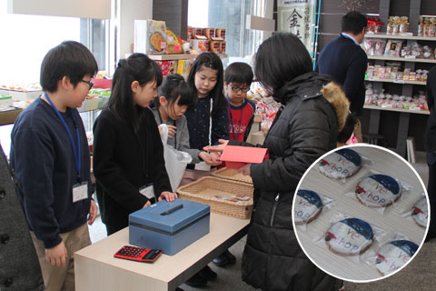 24日、町内製菓店「梅月」のご協力により、店舗内の一画に小学生による「FiveShop」がオープンしました。これは、羽幌町商工会青年部による次世代の起業家、まちづくりの担い手育成のためのベンチャーキッズ支援事業の一環で、この事業に参加した羽幌小学校の4.5年生の5人が、この日のために、会社の設立、販売計画や資金集め、仕入れや広告宣伝などを学び、1日限りのオープンに向けて、ポスターを作って宣伝したりオロ坊や会社の名前をデザインした商品の制作などの準備してきました。午後1時に店がオープンすると早速お客さんが来店し、子どもたちの「いらっしゃいませ」、「ありがとうございました」が店内に響きました。