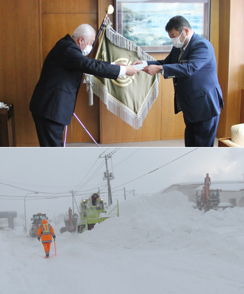 1月29日、国道の維持管理を行っている株式会社道北土木が地域貢献活動の一つとして、中央公民館、すこやか健康センター、勤労青少年ホームが面している南2丁目通りおよび各施設の駐車場の排雪作業を実施されました。また、2月8日には役場応接室で駒井町長から同社に感謝状が贈呈されました。ご厚意に感謝します。ありがとうございました。