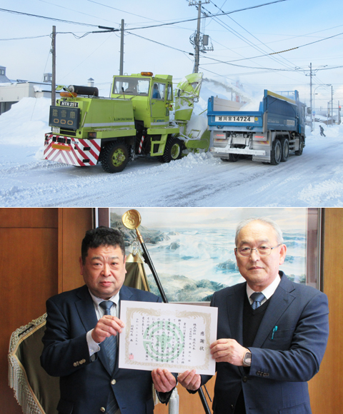 2月9日、株式会社道北土木が地域貢献活動の一つとして、中央公民館、すこやか健康センター、勤労青少年ホームが面している南2丁目通りおよび各施設の駐車場の排雪作業を実施されました。2月19日には役場応接室で森町長から同社に感謝状を贈呈しました。ご厚意に感謝します。ありがとうございました。