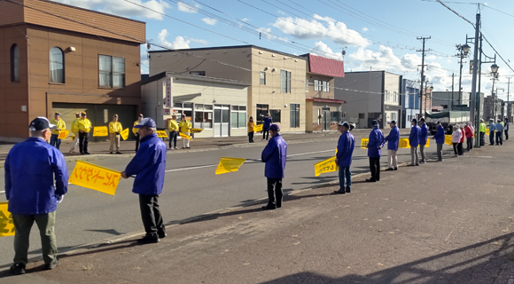 22日、羽幌町老人福祉センター前において羽幌町・羽幌警察署等主催による秋の交通安全セーフティーコールが行われ、関係7団体から約30名が集まりました。出動式では羽幌ライオンズクラブより交通安全旗100枚、羽幌ロータリークラブより交通安全旗50枚をそれぞれご寄贈いただきました。その後は老人福祉センター前と向かいの歩道に分かれ、旗を持ち交通安全を促しました。