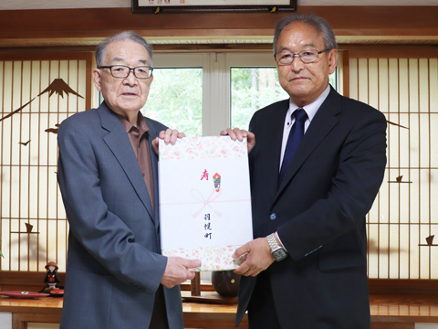 なお、特別養護老人ホームしあわせ荘に入所されている対象の方は、9月17日に開催されたしあわせ荘敬老会祝賀式典で森町長が記念品を贈呈しました。また、焼尻地区は8日に、天売地区は18日に支所の職員からお渡ししました。