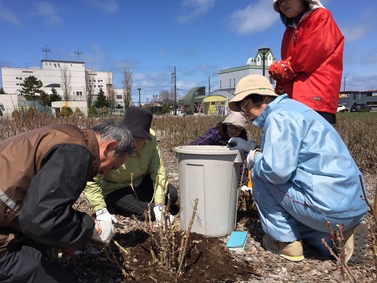 札幌大通公園バラ園ボランティアの方々と一緒に摘蕾作業