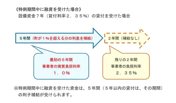 ※特例期間中に新たに融資を受けた資金については、5年間(5年以内の貸付の場合は、その貸付期間)の特例による利子補給が受けられます。