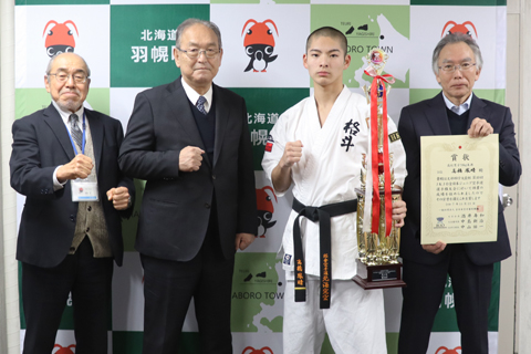 11月28日、北海道格斗クラブ羽幌道場に所属する羽幌高校2年の高橋鳳晴さんが役場を訪れました。高橋さんは、11月23日に国立代々木競技場第一体育館で開催された文部科学大臣杯第19回JKJO全日本ジュニア空手道選手権大会の高校男子70㎏未満の部で3位を獲得したことを森町長、三浦副町長、濱野教育長に報告しました。この度の入賞おめでとうございます。