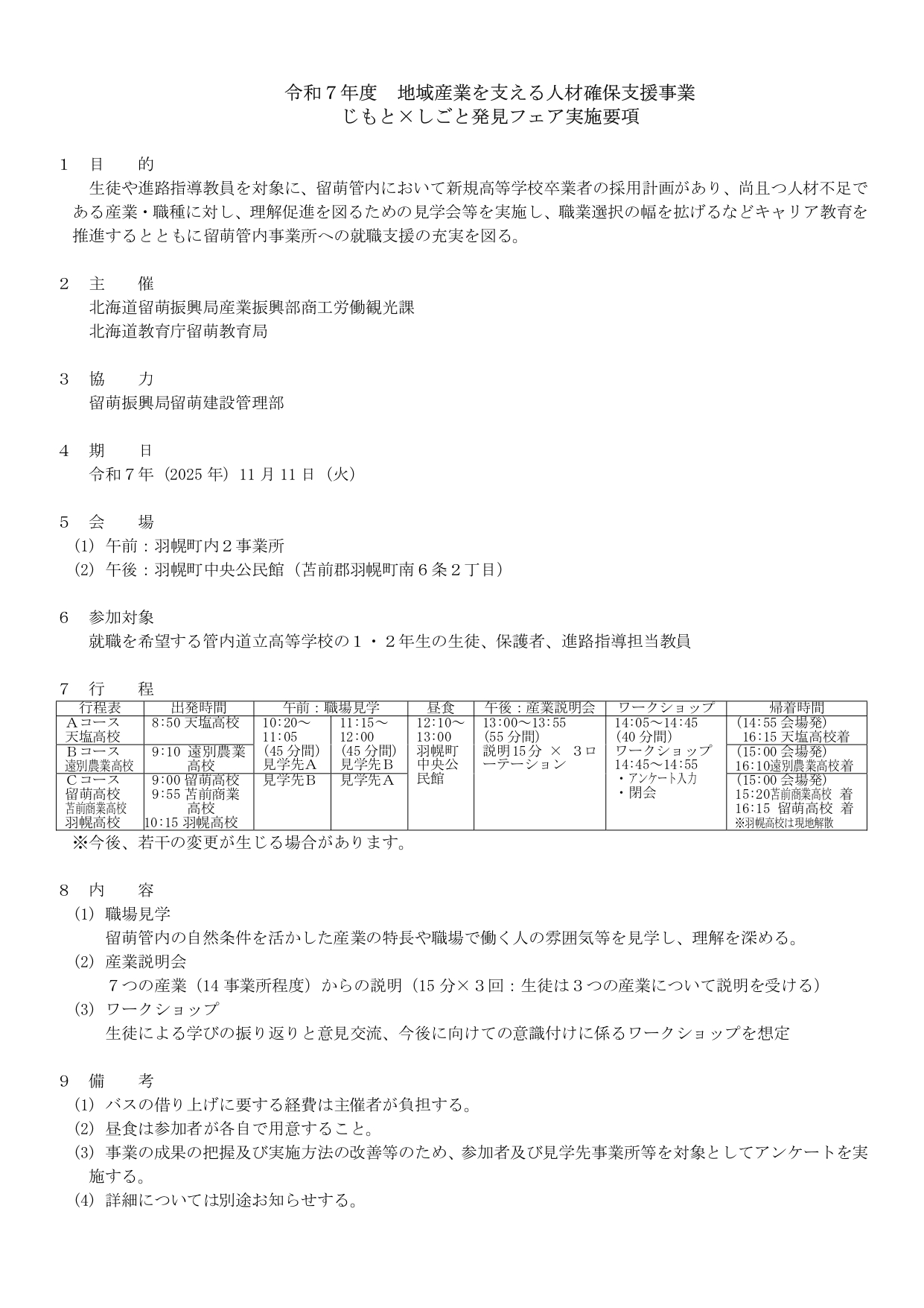 北海道留萌振興局主催で管内道立高等学校の生徒(1・2年生)や進路指導教員等を対象に、管内の産業・職種等について生徒の理解を深めることを目的とした「じもと×しごと発見フェア」が開催されます。