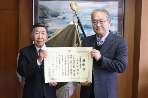 12月10日、役場で北海道社会貢献賞(自治功労者)の表彰伝達式が行われ、受賞した船本秀雄さんに森町長が表彰状と記念品を手渡しました。船本さんは平成19年5月から令和5年4月まで、4期16年間の長きにわたり町議会議員を務め、在任中は総務産業常任委員会副委員長や羽幌中心市街地活性化等調査研究特別委員会委員長等数々の要職を歴任し、地域の振興発展や住民の福祉向上に多大な貢献をされたことが評価されました。この度の受賞おめでとうございます。