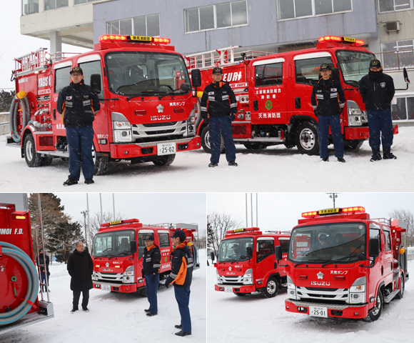 12月17日に役場前で更新した天売・焼尻消防団の消防車両がお披露目されました。消防車両の更新は、天売消防団では27年ぶりに、焼尻消防団では28年ぶりになります。更新した車両は、車体本体に消防ポンプを搭載したタイプで、水利からタンク車へ中継する元ポンプとしての運用を想定し、放水量を重視しています。今後、水利の乏しい離島で火災が発生したときに活躍するものと期待しています。