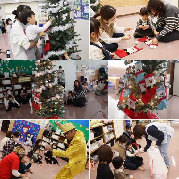 12月2日、子育て支援センター「うさこちゃん遊びの広場」で毎年恒例のクリスマスツリー飾りが行われました。はじめに親子でクリスマスツリーに飾るサンタクロースなどの靴下を作成。大きな靴下に顔のパーツをボンドで付け、完成品をクリスマスツリーに飾りライトアップ。子ども達は光るツリーにとても感激していました。その後行われたマジックショーでは、手品師ミスターゼロがバラバラの4つのリングを繋げるマジックなどを披露し、子ども達の注目を集めていました。最後に少し早いクリスマスプレゼントとケーキを受け取り、子ども達はとても喜んでいました。