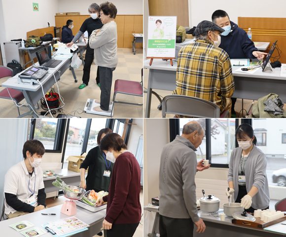 21日、すこやか健康センターではぼろ健康まつりが開催されました。 会場には椅子に座った状態から立ち上がることで筋肉量や体脂肪量などを測定できるコーナーや手のひらで野菜の摂取量を測定できるコーナーの他、計量器を見ずに野菜350gをぴったりに当てるチャレンジコーナーや適切な塩分のみそ汁と濃い味の味噌汁を飲み比べる試飲コーナーなどが設けられ、参加者たちは体験しながら自身の健康を見つめ直す良い機会となったようです。