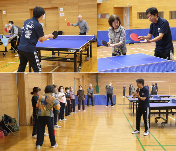 10月29日から31日までの3日間、地域おこし協力隊の内田隊員が指導する初心者卓球教室が総合体育館で行われ、参加者が楽しみながら汗を流しました。30日の教室では、はじめにラケットの構え方の説明を受けた後、フォアハンド、バックハンド、ツッツキの3種類の基本的な打ち方を教わりました。最後は内田隊員が数種類のサーブを見せて、その中から自分ができそうなサーブにチャレンジしました。