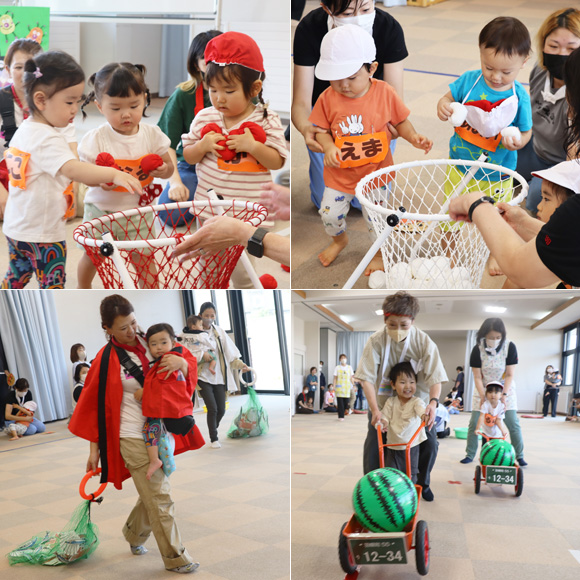 3日、すこやか健康センターでうさこちゃん遊びの広場「ミニミニ運動会」が開催され、15組(総勢38名)の親子が赤白の2チームに分かれて参加しました。1回目の「玉入れ」では赤白共に37個とまさかの引き分けに。2回目は赤27個、白43個で白組が勝利しました。その他、2輪車ですいかを運ぶ「すいかの名産地」や約10年ぶりに復活した「大漁だよ!おっかさん」など色々な競技に元気よく参加しました。