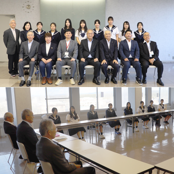 9月1日から7日までの間、韓国の素明女子高等学校へ短期留学をした羽幌高校生8人が9月22日に役場を訪れ、韓国での交流などについて森町長に報告しました。