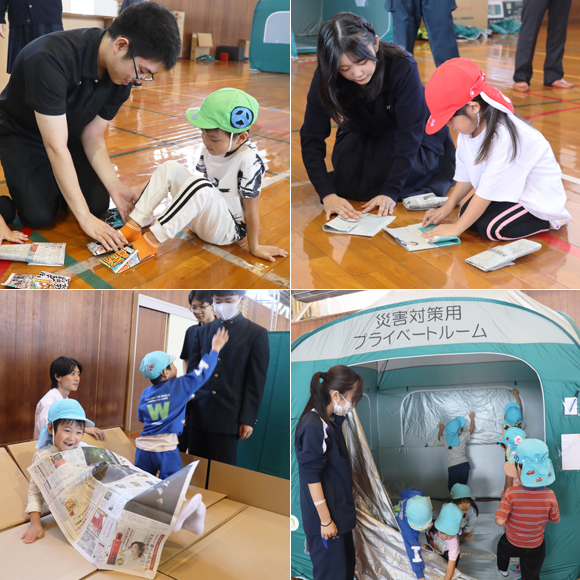 9月26日、羽幌高校で防災1日教室が行われました。避難訓練誘導では、3年生の生徒が体育館に避難に来た認定こども園まきの園児たちにスリッパ新聞紙の作り方などを教えました。